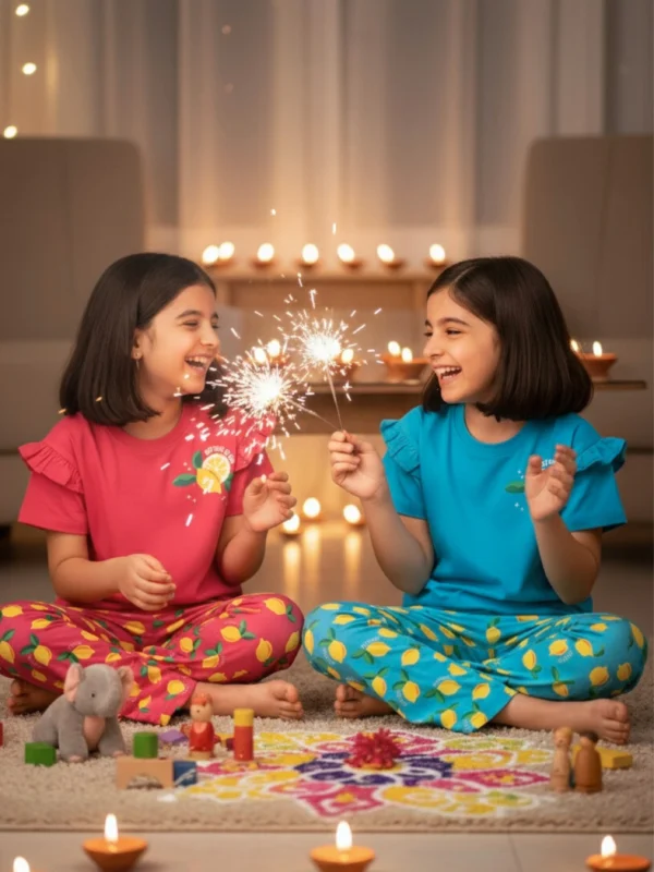 Playful Citrus Print – A vibrant red base with bright lemon motifs that make the outfit lively and stylish.