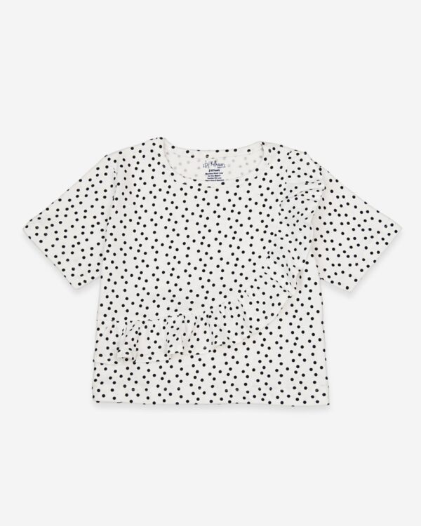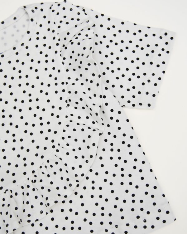 Features a playful black dot print for added charm